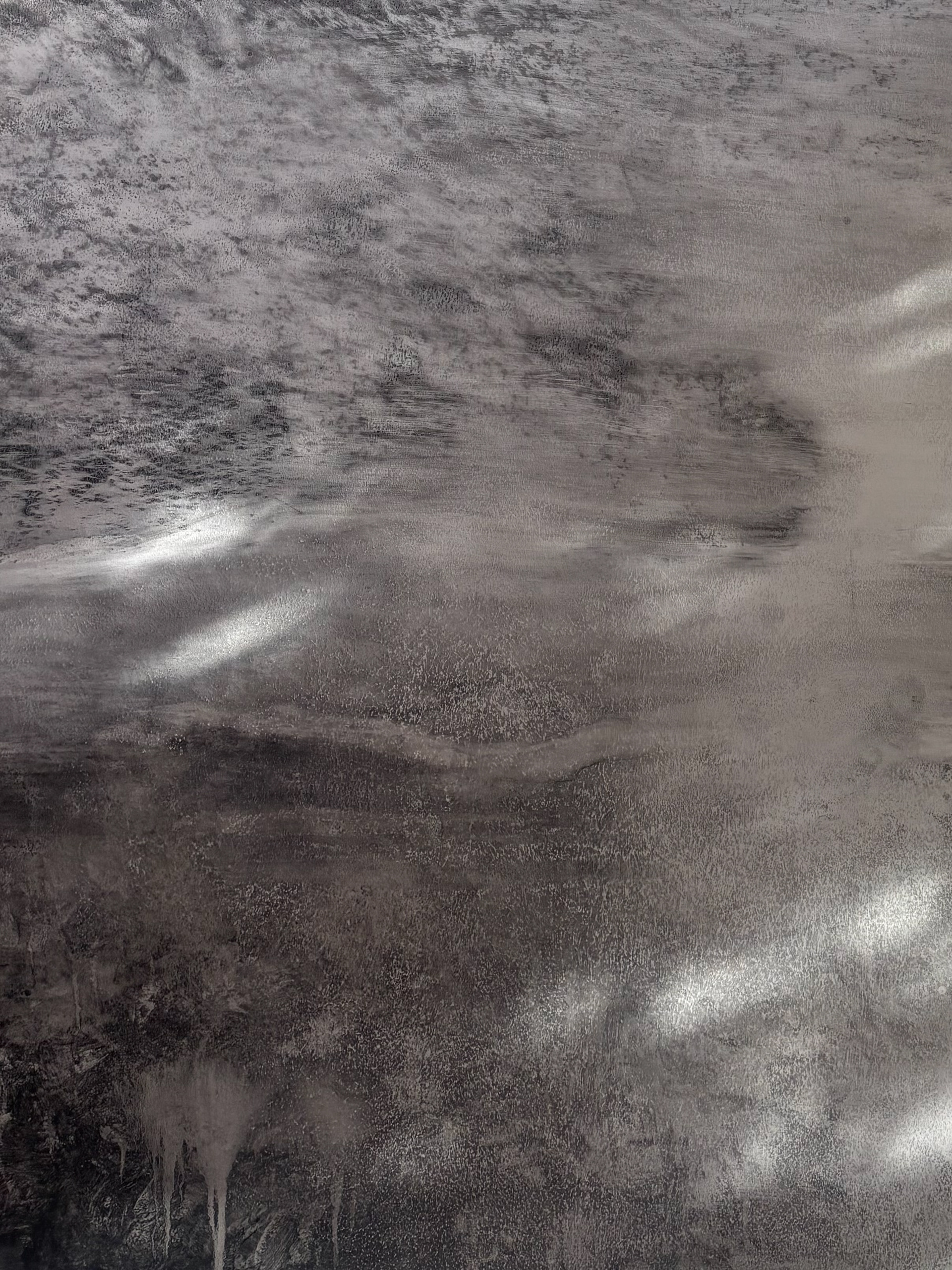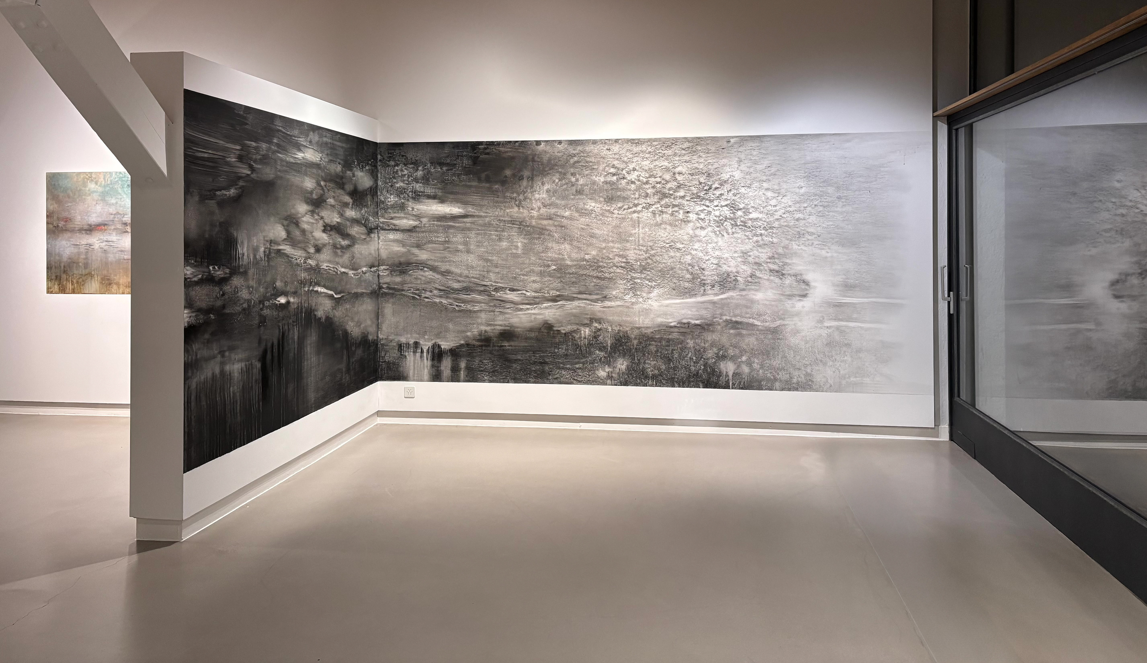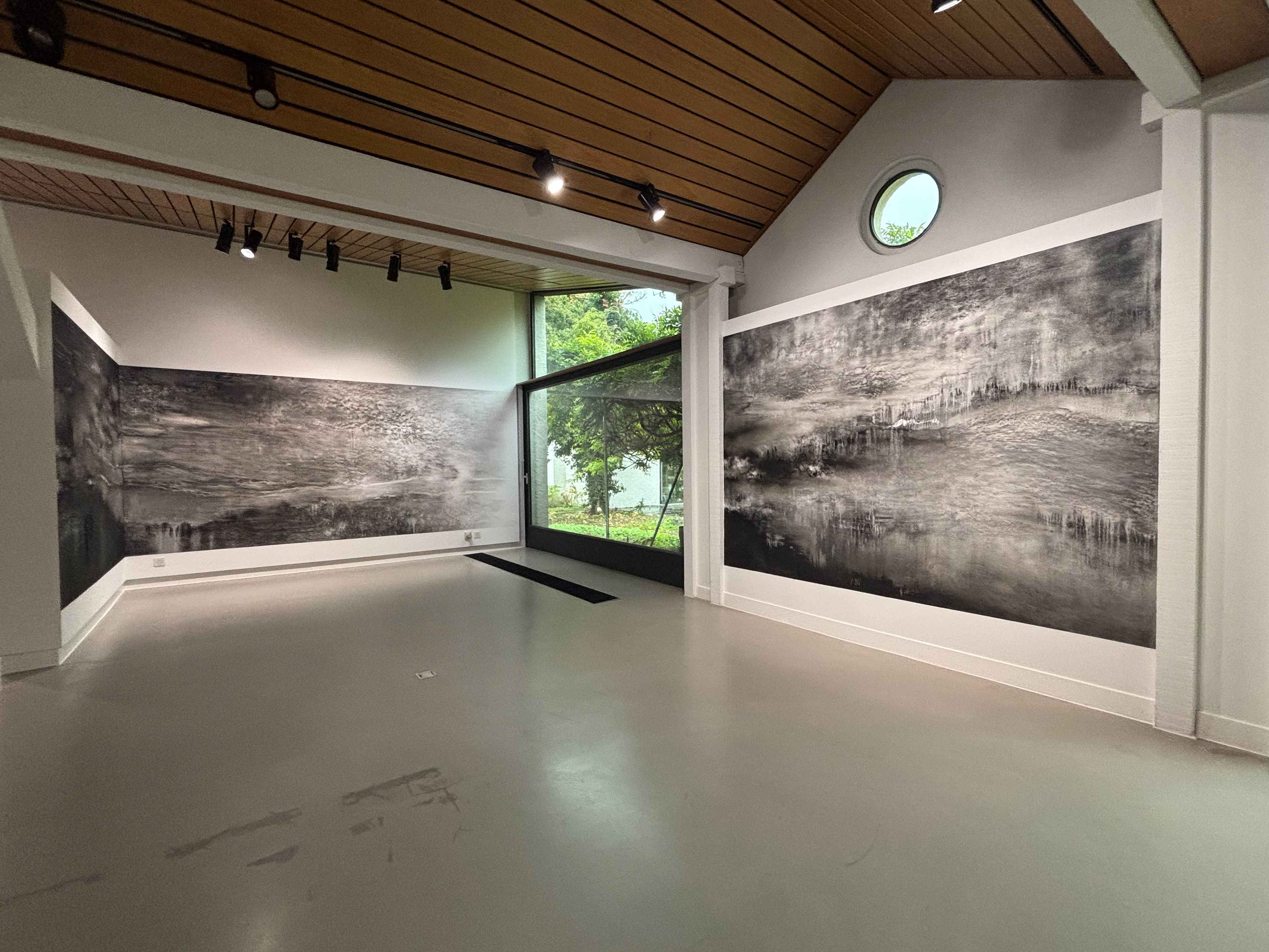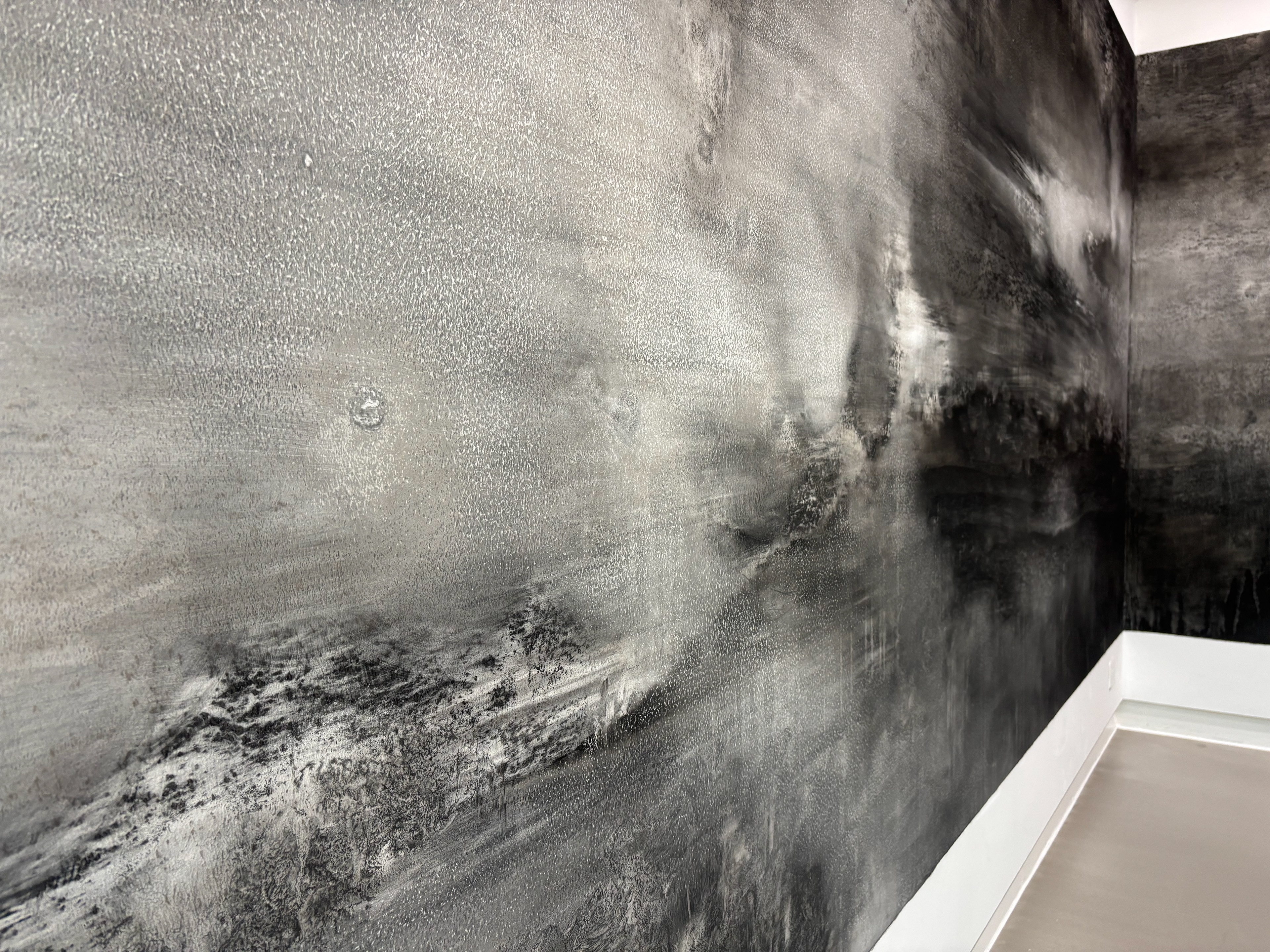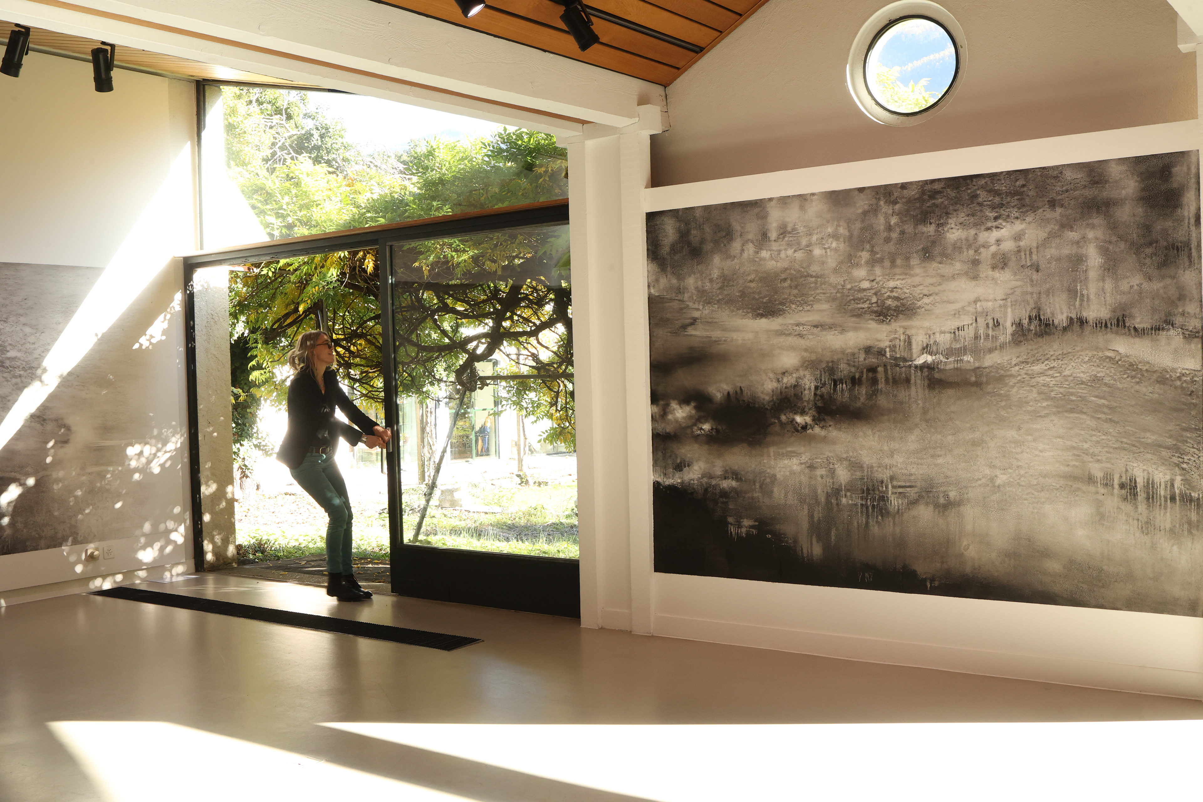 « Esquisse murale », ce terme indique d’emblée avec humilité la recherche d’infini en jeu dans l’œuvre de l’artiste. Une manière peut-être encore et selon le mot d’Aragon à vingt ans de « faire entrer l’infini ». Les outils choisis pour ce processus sont le fusain et l’eau. Le fusain comme chacun sait, est le résultat d’un bois calciné (fusain de saule, gras/sec et compressé) et c’est comme une force d’incandescence cachée qui guide les mains de l’artiste dans une recherche graphique où rejaillit un souffle qui n’est pas sans rappeler celui qui vous prend droit au cœur lorsque vous pénétrez dans les dessins d’une grotte préhistorique. Mais ici nulle présence animale ou humaine, des fragments de nature, de paysages vus et réinterprétés dans une vision subjective où débordent des coulées de falaises suggérées, des vagues de torrents qui se déversent sur on ne sait quel rivage imaginaire. L’artiste a fait de nombreux voyages au Japon. Elle en a gardé le goût de « la contemplation des pierres de lettrés (Gongshi en chinois et Suiseki en japonais) {qui} est un art en soi ». Ariane Monod nous propose alors des images façonnées « par le vent et l’eau ». Si l’Orient est présent, la fresque nous renvoie à quantité de lieux vus dont elle dégage et abstrait un paysage dont l’immobilité n’en est qu’une illusion. Il y a plutôt « arrêt sur image ». Dans un monde porté par la force du souffle. Le vent s’est levé et c’est alors comme des traces d’ondes en mouvement quand l’eau a été caressée d’un seul objet, d’un seul battement d’aile, même d’oiseaux absents. Des coulures rupestres ont laissé leurs dessins comme des pleurs de nature alanguie en recherche de traces d’éternité.
