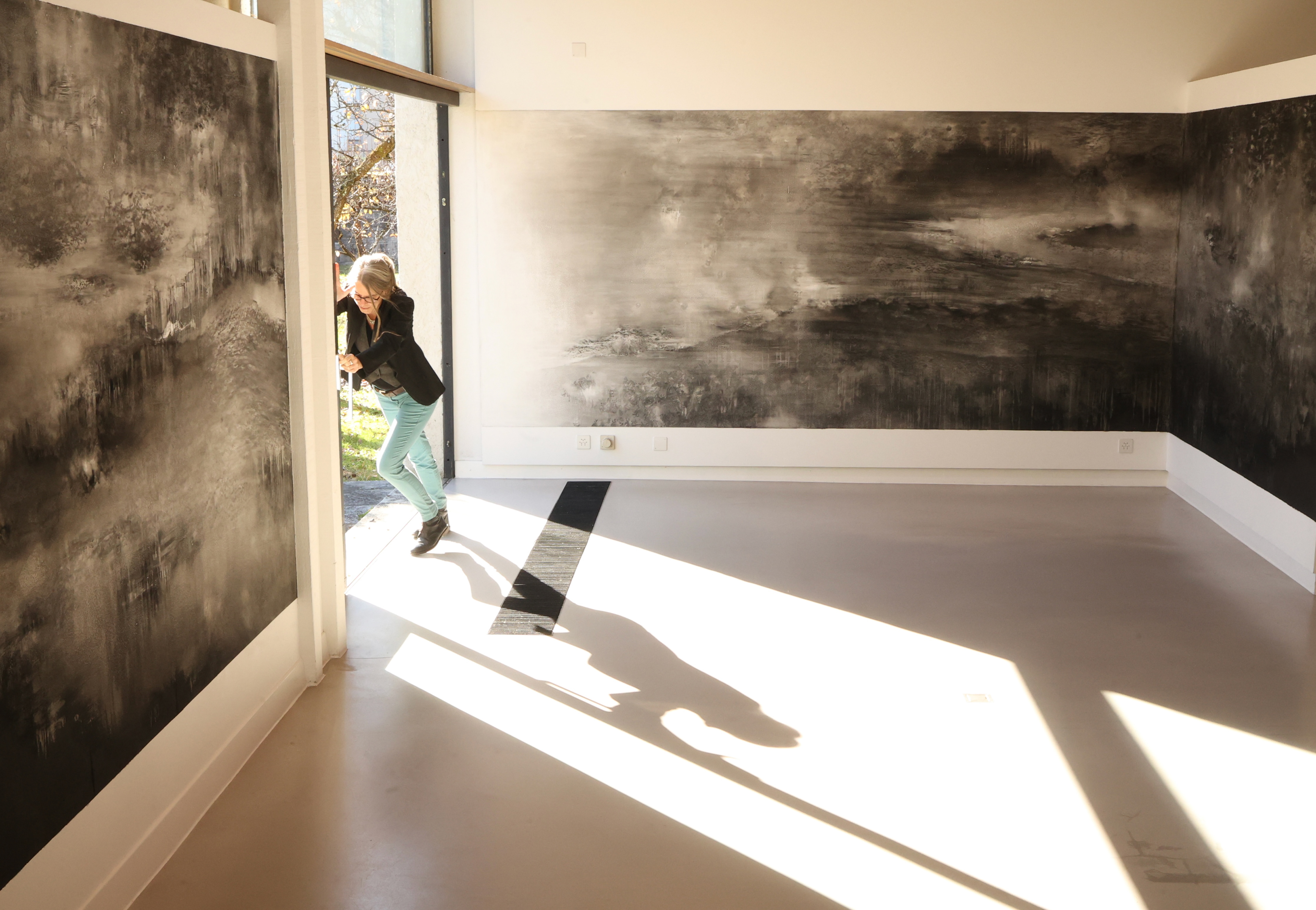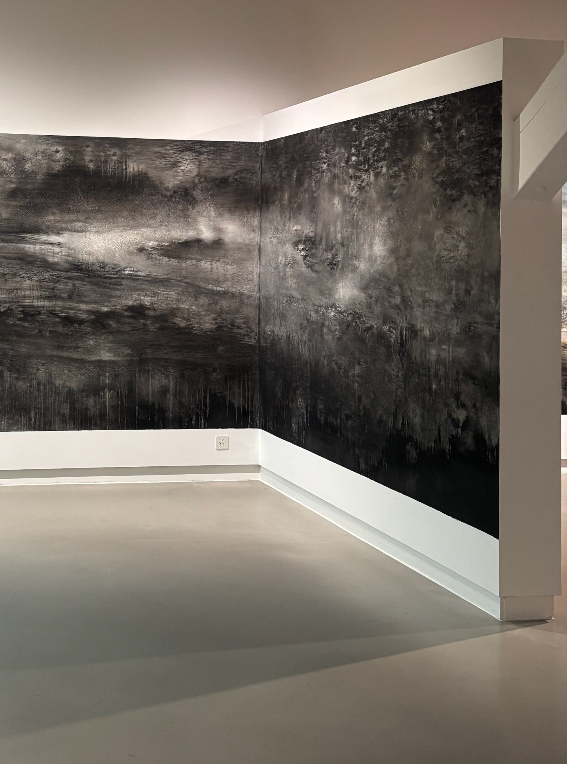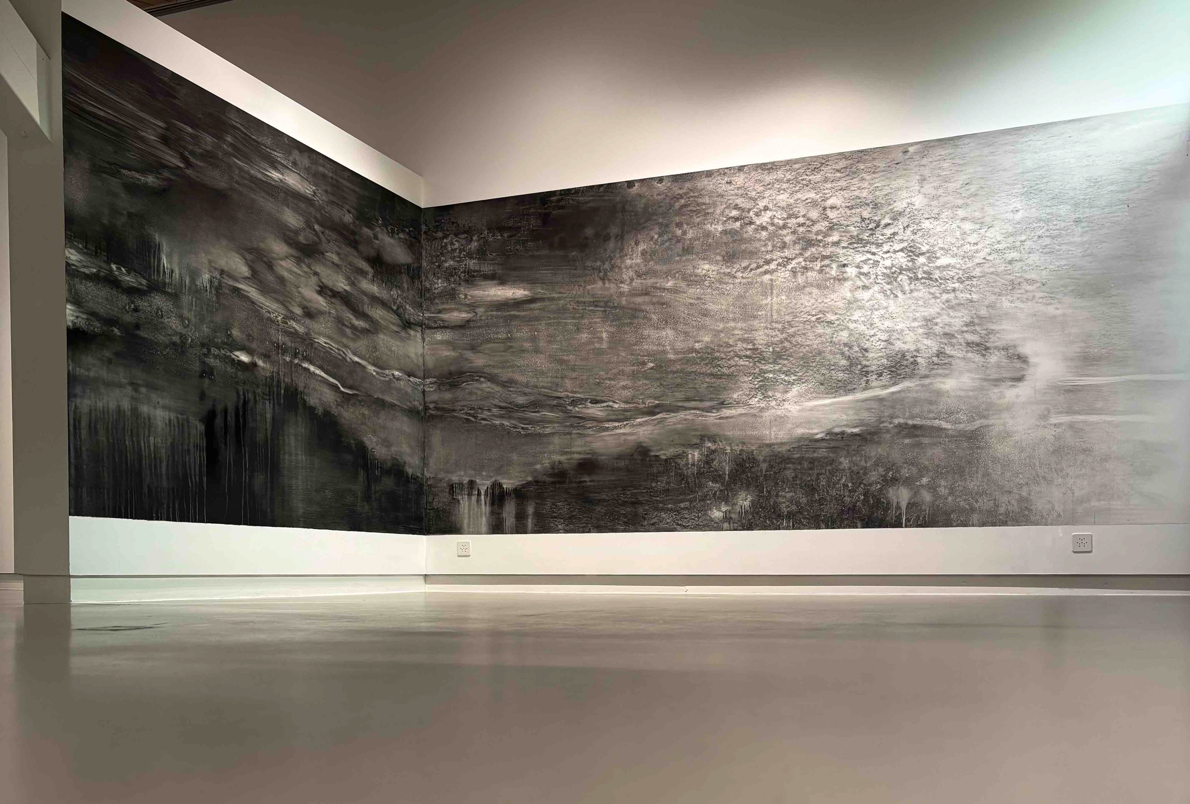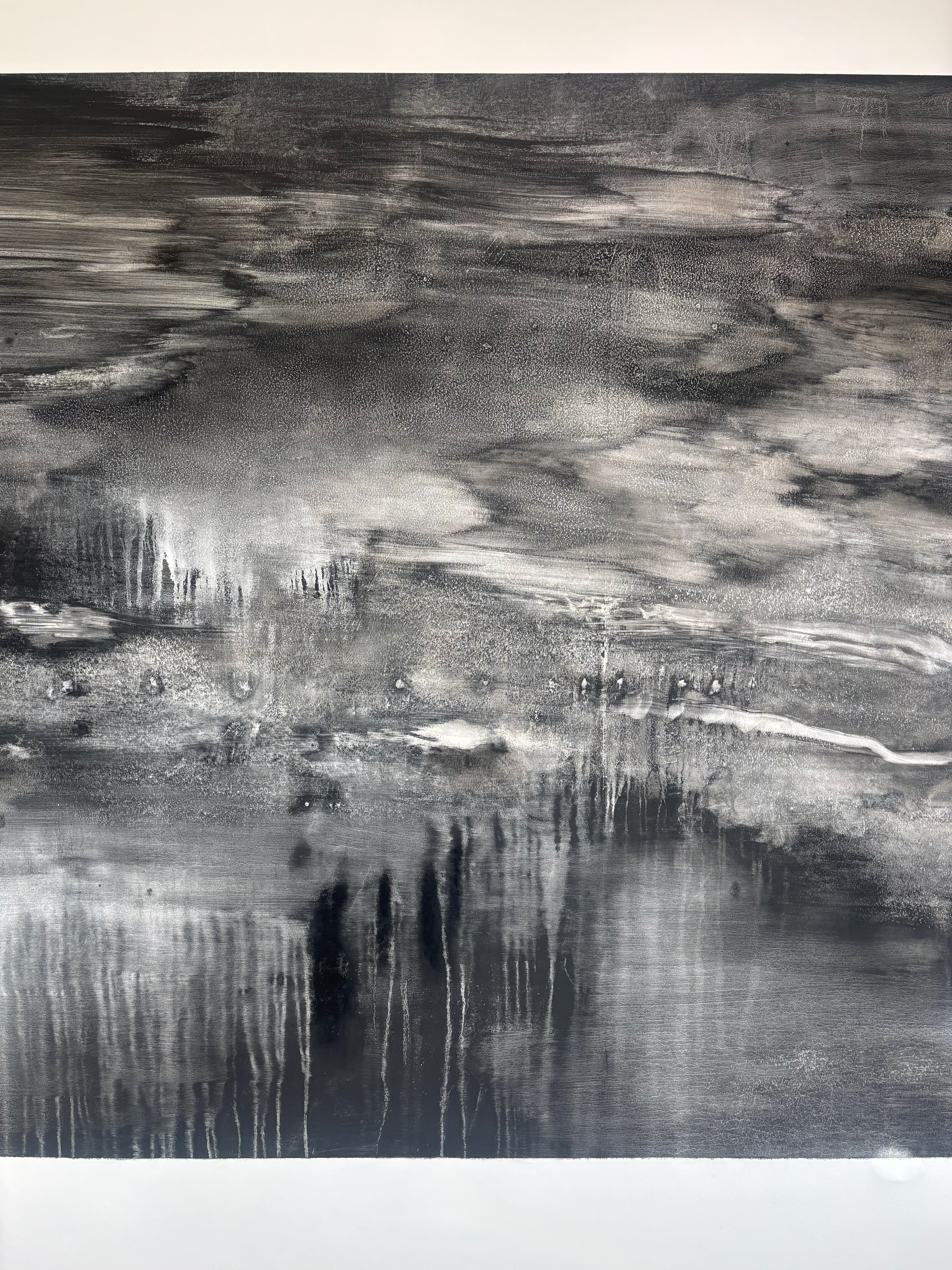 « Esquisse murale », ce terme indique d’emblée avec humilité la recherche d’infini en jeu dans l’œuvre de l’artiste. Une manière peut-être encore et selon le mot d’Aragon à vingt ans de « faire entrer l’infini ». Les outils choisis pour ce processus sont le fusain et l’eau. Le fusain comme chacun sait, est le résultat d’un bois calciné (fusain de saule, gras/sec et compressé) et c’est comme une force d’incandescence cachée qui guide les mains de l’artiste dans une recherche graphique où rejaillit un souffle qui n’est pas sans rappeler celui qui vous prend droit au cœur lorsque vous pénétrez dans les dessins d’une grotte préhistorique. Mais ici nulle présence animale ou humaine, des fragments de nature, de paysages vus et réinterprétés dans une vision subjective où débordent des coulées de falaises suggérées, des vagues de torrents qui se déversent sur on ne sait quel rivage imaginaire. L’artiste a fait de nombreux voyages au Japon. Elle en a gardé le goût de « la contemplation des pierres de lettrés (Gongshi en chinois et Suiseki en japonais) {qui} est un art en soi ». Ariane Monod nous propose alors des images façonnées « par le vent et l’eau ». Si l’Orient est présent, la fresque nous renvoie à quantité de lieux vus dont elle dégage et abstrait un paysage dont l’immobilité n’en est qu’une illusion. Il y a plutôt « arrêt sur image ». Dans un monde porté par la force du souffle. Le vent s’est levé et c’est alors comme des traces d’ondes en mouvement quand l’eau a été caressée d’un seul objet, d’un seul battement d’aile, même d’oiseaux absents. Des coulures rupestres ont laissé leurs dessins comme des pleurs de nature alanguie en recherche de traces d’éternité.
