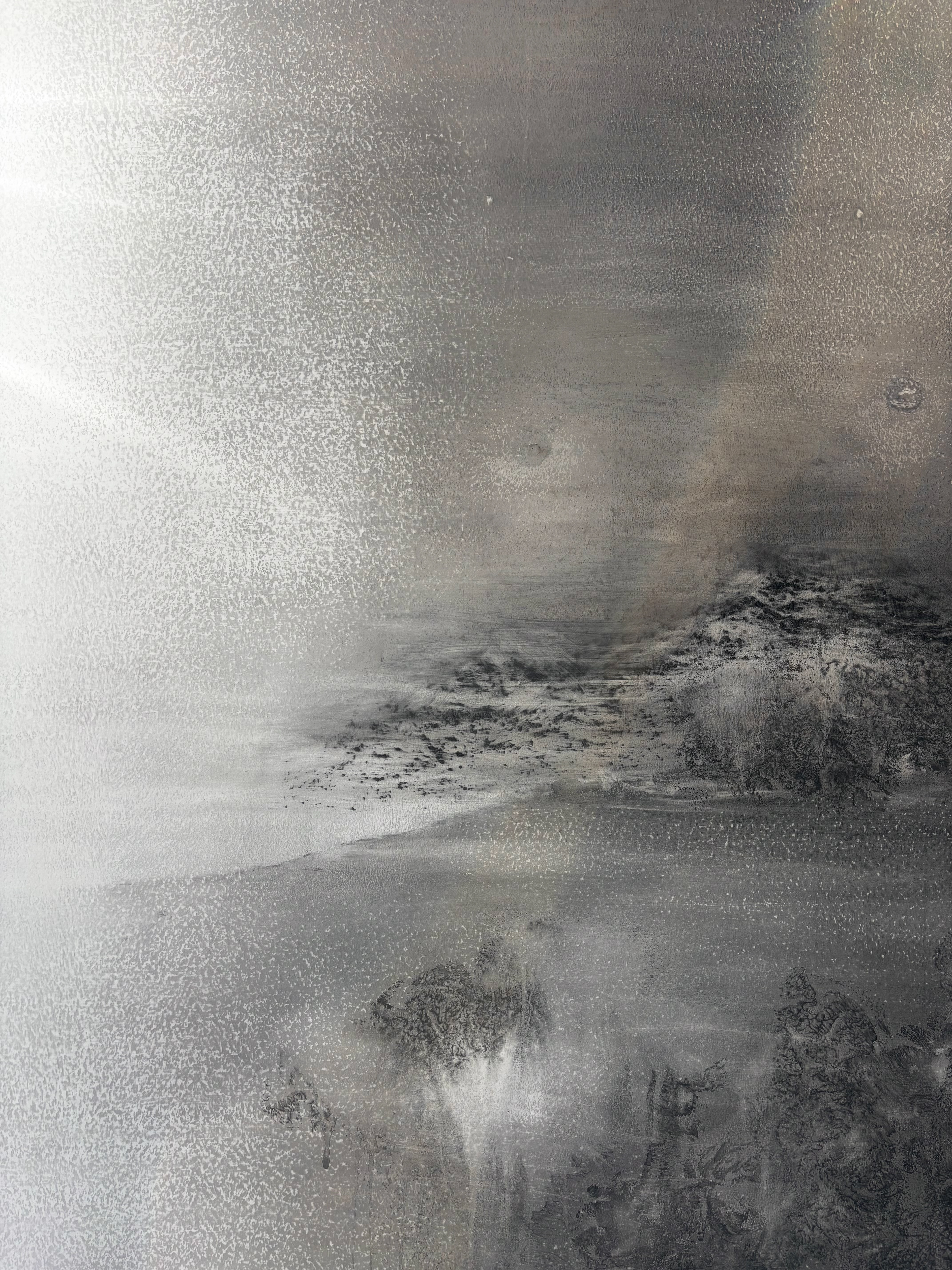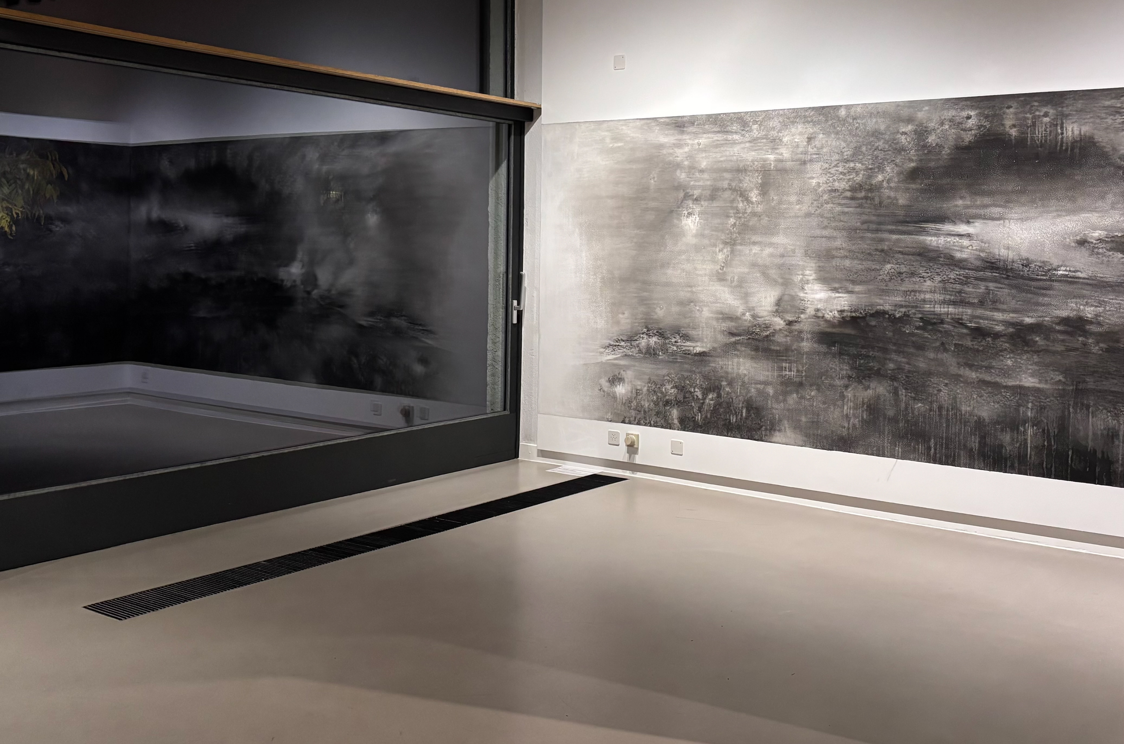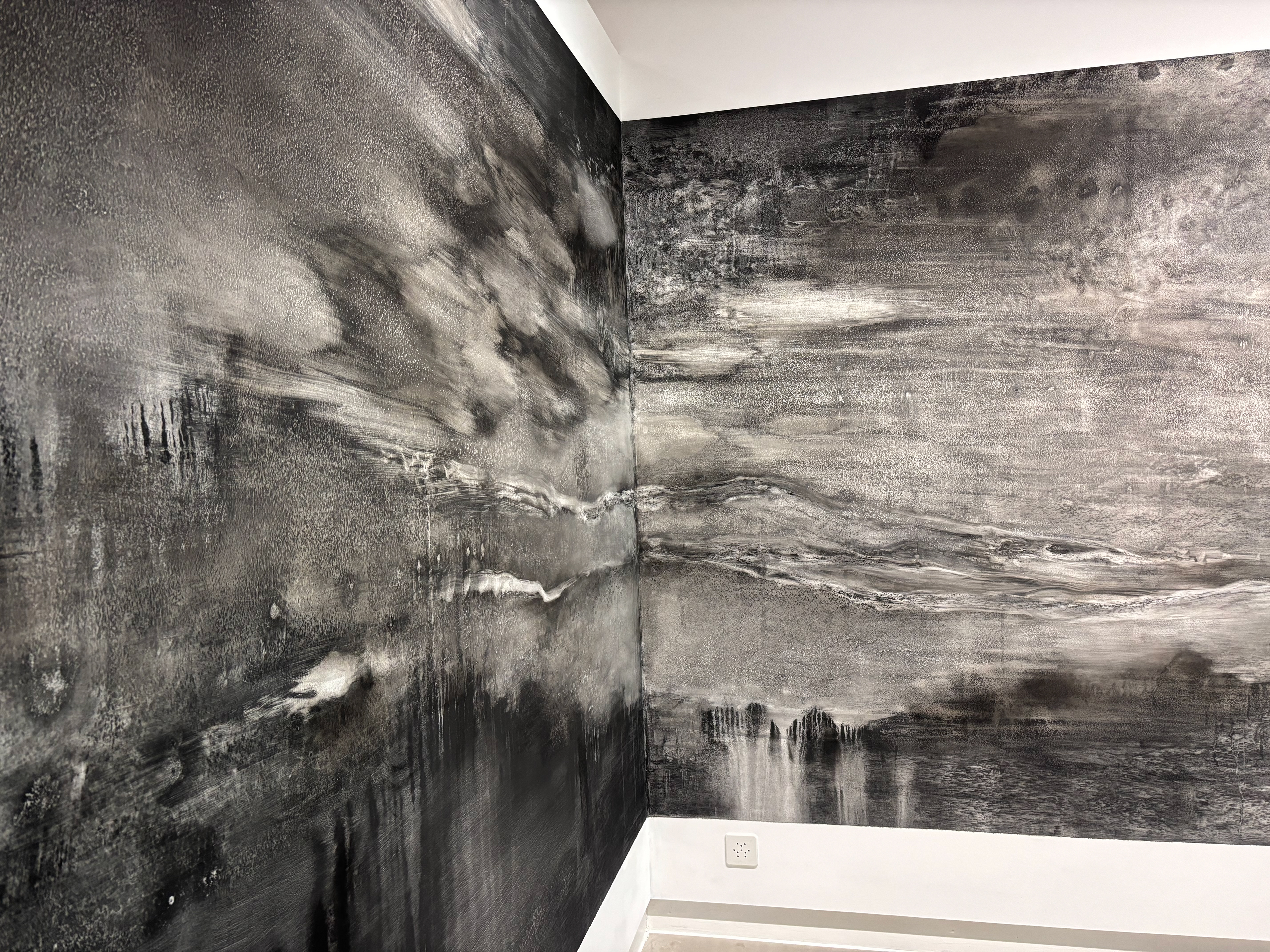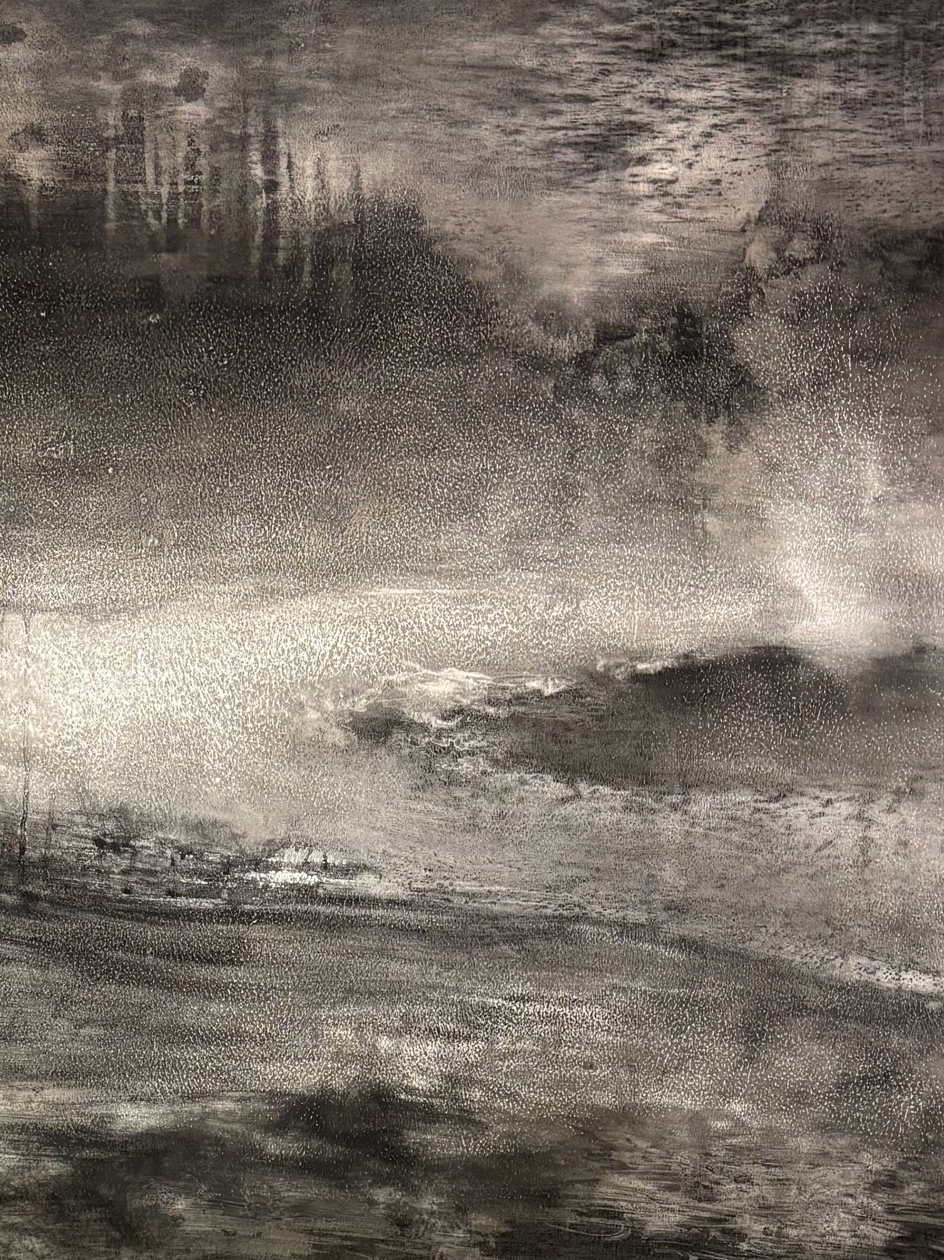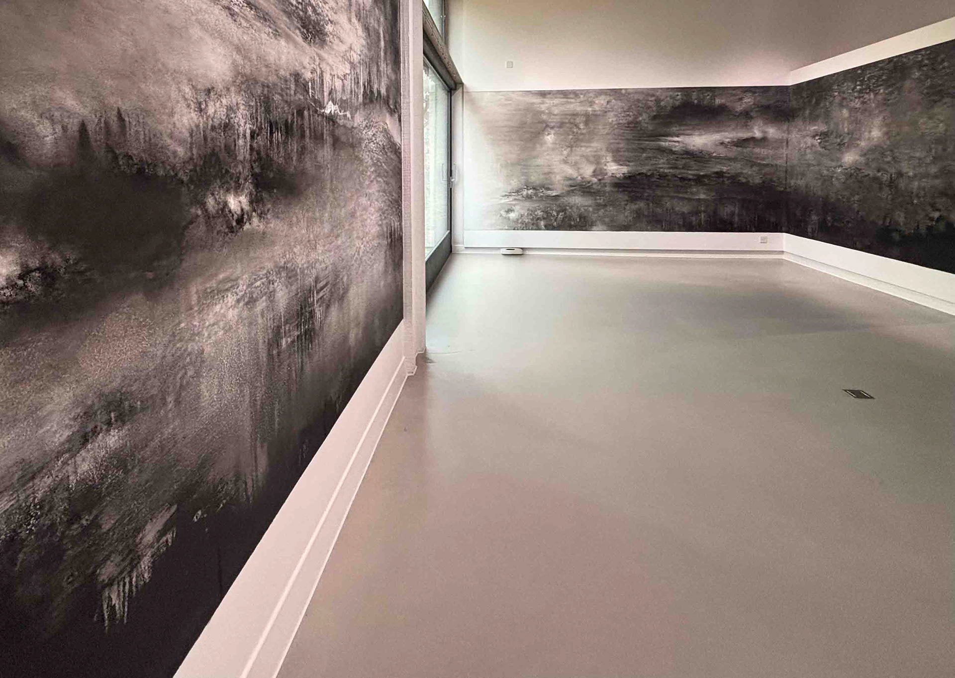 « Esquisse murale », ce terme indique d’emblée avec humilité la recherche d’infini en jeu dans l’œuvre de l’artiste. Une manière peut-être encore et selon le mot d’Aragon à vingt ans de « faire entrer l’infini ». Les outils choisis pour ce processus sont le fusain et l’eau. Le fusain comme chacun sait, est le résultat d’un bois calciné (fusain de saule, gras/sec et compressé) et c’est comme une force d’incandescence cachée qui guide les mains de l’artiste dans une recherche graphique où rejaillit un souffle qui n’est pas sans rappeler celui qui vous prend droit au cœur lorsque vous pénétrez dans les dessins d’une grotte préhistorique. Mais ici nulle présence animale ou humaine, des fragments de nature, de paysages vus et réinterprétés dans une vision subjective où débordent des coulées de falaises suggérées, des vagues de torrents qui se déversent sur on ne sait quel rivage imaginaire. L’artiste a fait de nombreux voyages au Japon. Elle en a gardé le goût de « la contemplation des pierres de lettrés (Gongshi en chinois et Suiseki en japonais) {qui} est un art en soi ». Ariane Monod nous propose alors des images façonnées « par le vent et l’eau ». Si l’Orient est présent, la fresque nous renvoie à quantité de lieux vus dont elle dégage et abstrait un paysage dont l’immobilité n’en est qu’une illusion. Il y a plutôt « arrêt sur image ». Dans un monde porté par la force du souffle. Le vent s’est levé et c’est alors comme des traces d’ondes en mouvement quand l’eau a été caressée d’un seul objet, d’un seul battement d’aile, même d’oiseaux absents. Des coulures rupestres ont laissé leurs dessins comme des pleurs de nature alanguie en recherche de traces d’éternité.