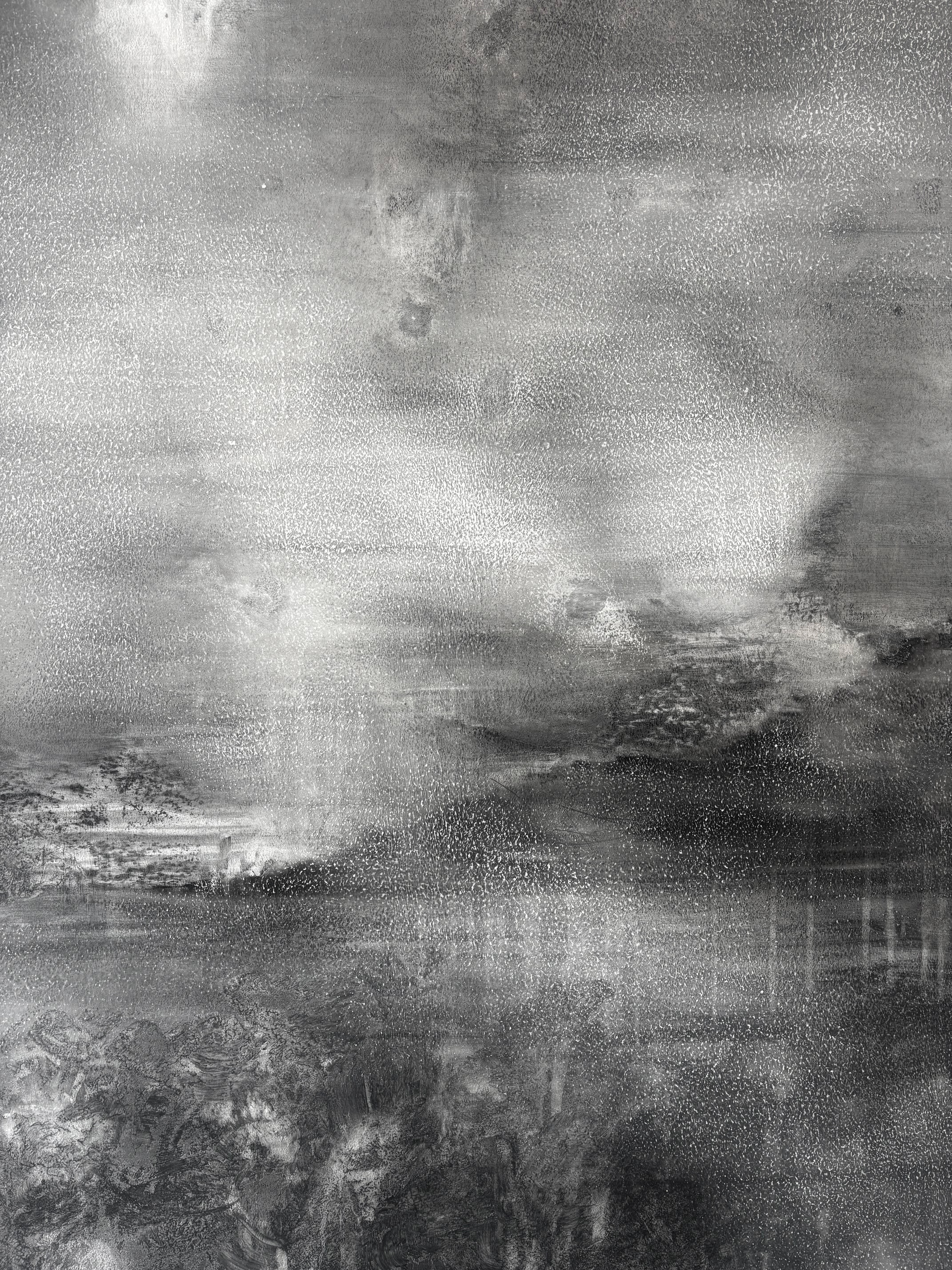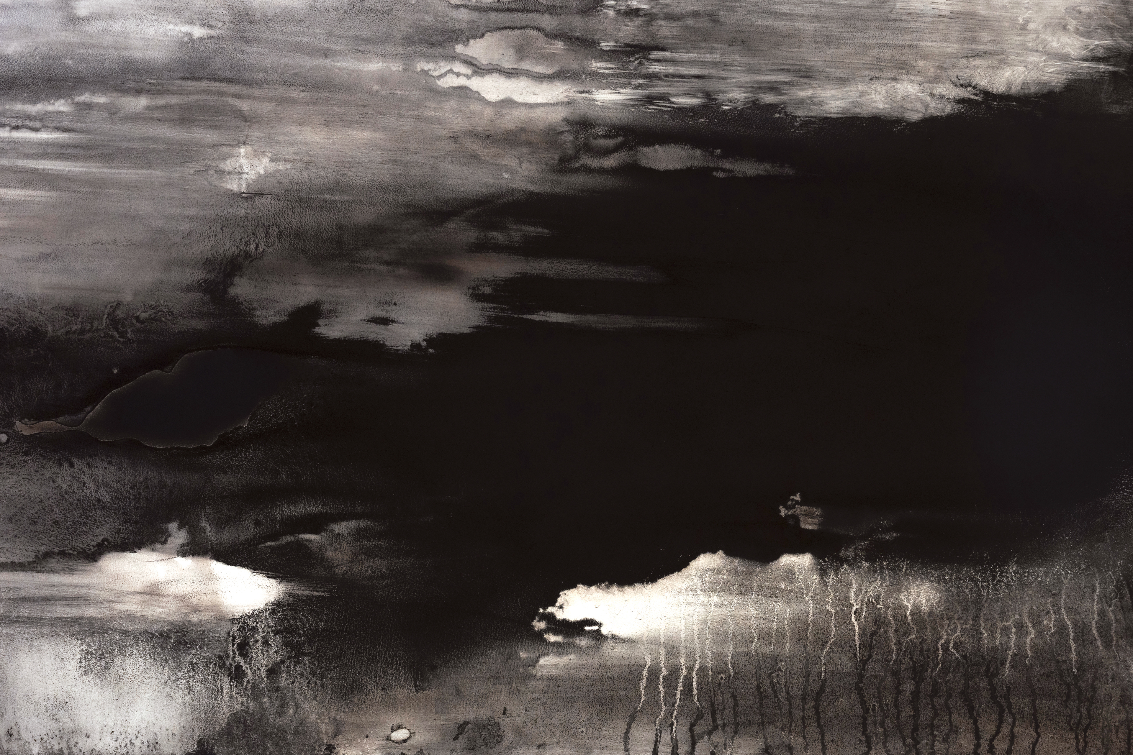 Si l’on peut peindre le monde, une vision du monde en noir et blanc, c’est sans doute aussi par un besoin impérieux de clarté. Si l’on peut métamorphoser une galerie d’art en un antre clair-obscur c’est sans doute dans la quête d’une invitation à voir, à sentir, à ressentir, à donner à voir l’inédit d’une mémoire enracinée. Le vrai passeport de l’artiste est peut-être celui de faire voyager les images par-delà les continents et de les retranscrire dans son intuition avec l’énergie particulière et subjective qui est la sienne. Ainsi nait entre Orient et Occident sa proposition paysagiste telle une gravure agrandie.
