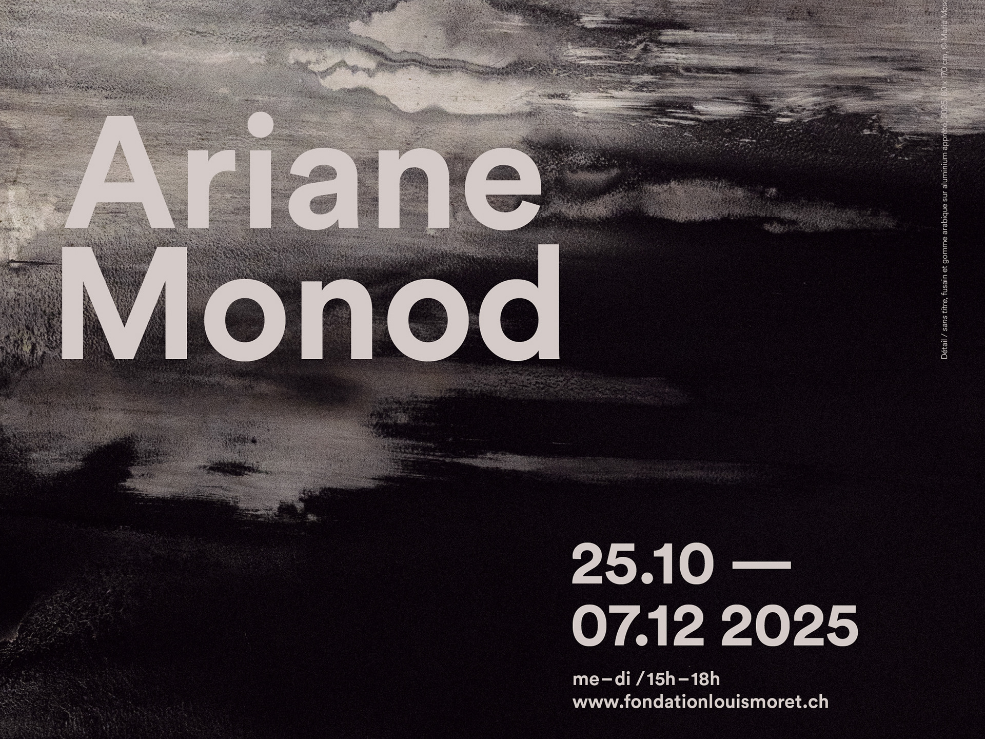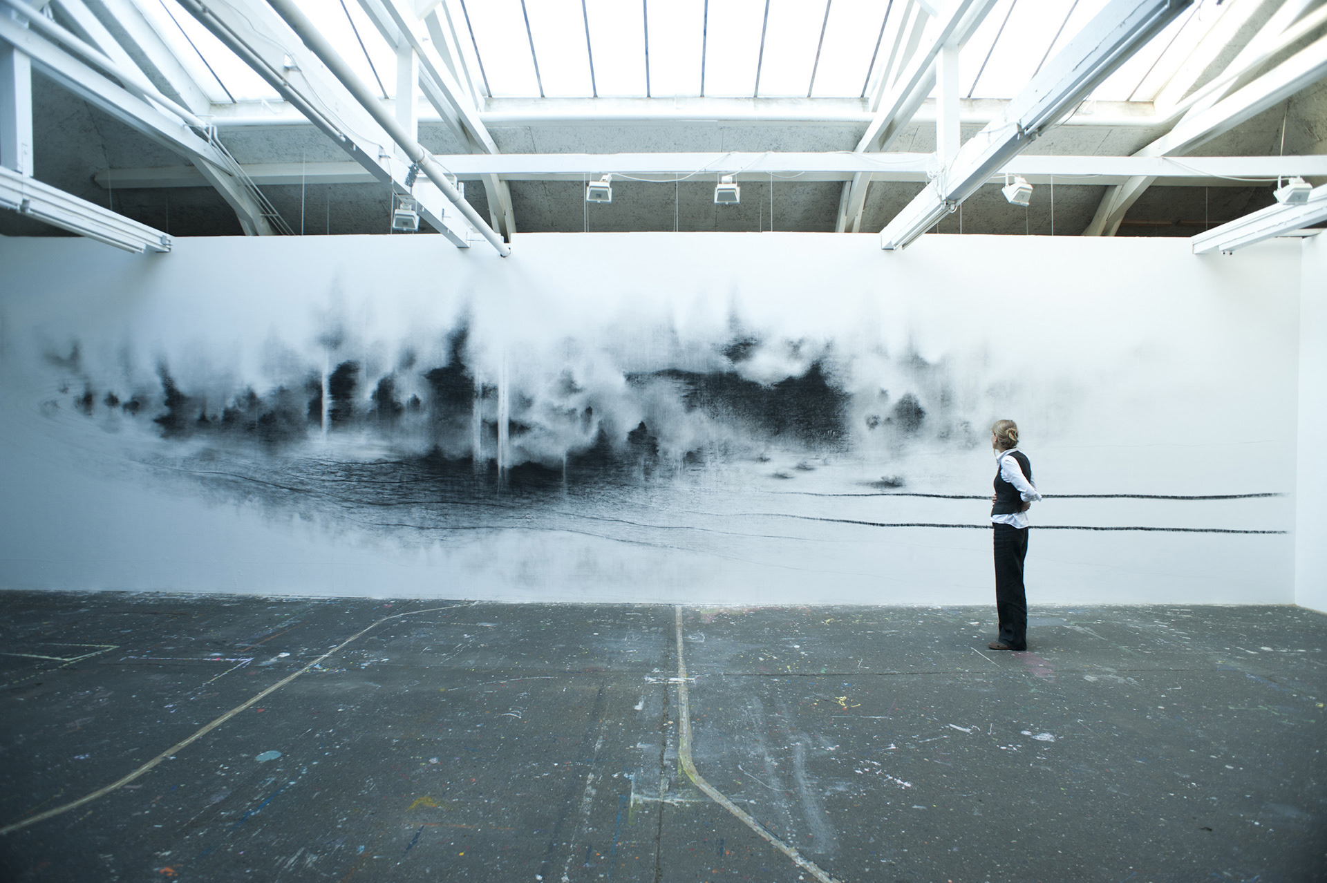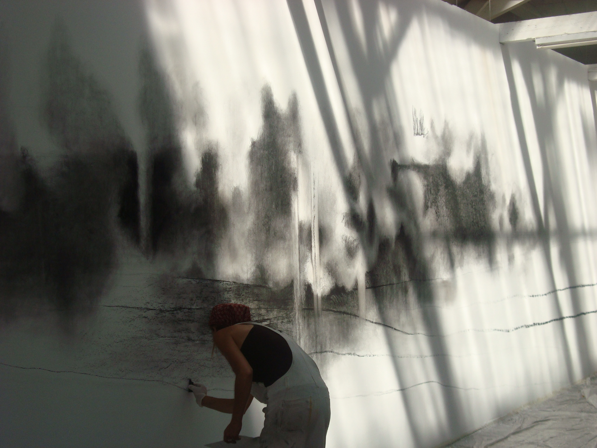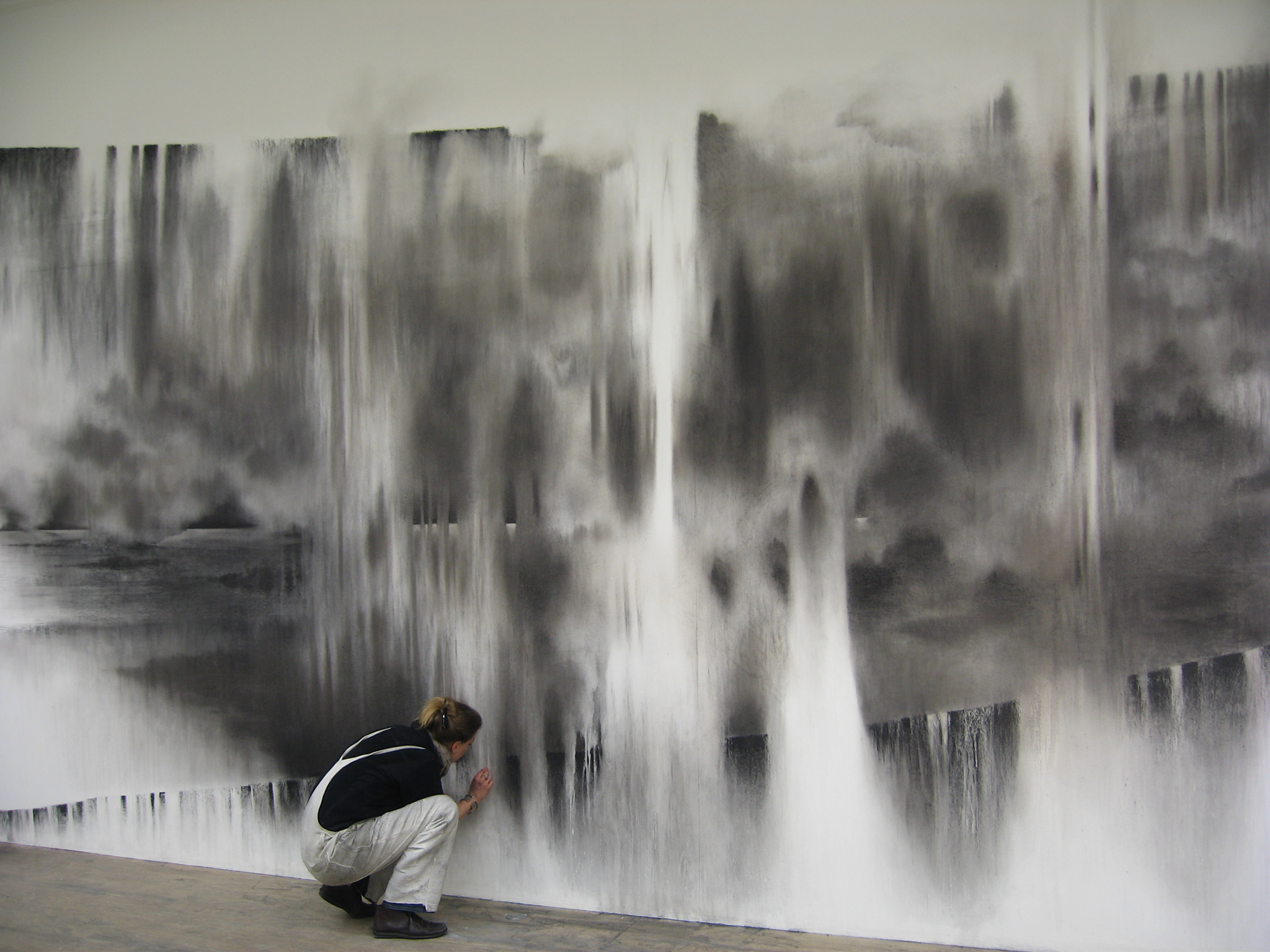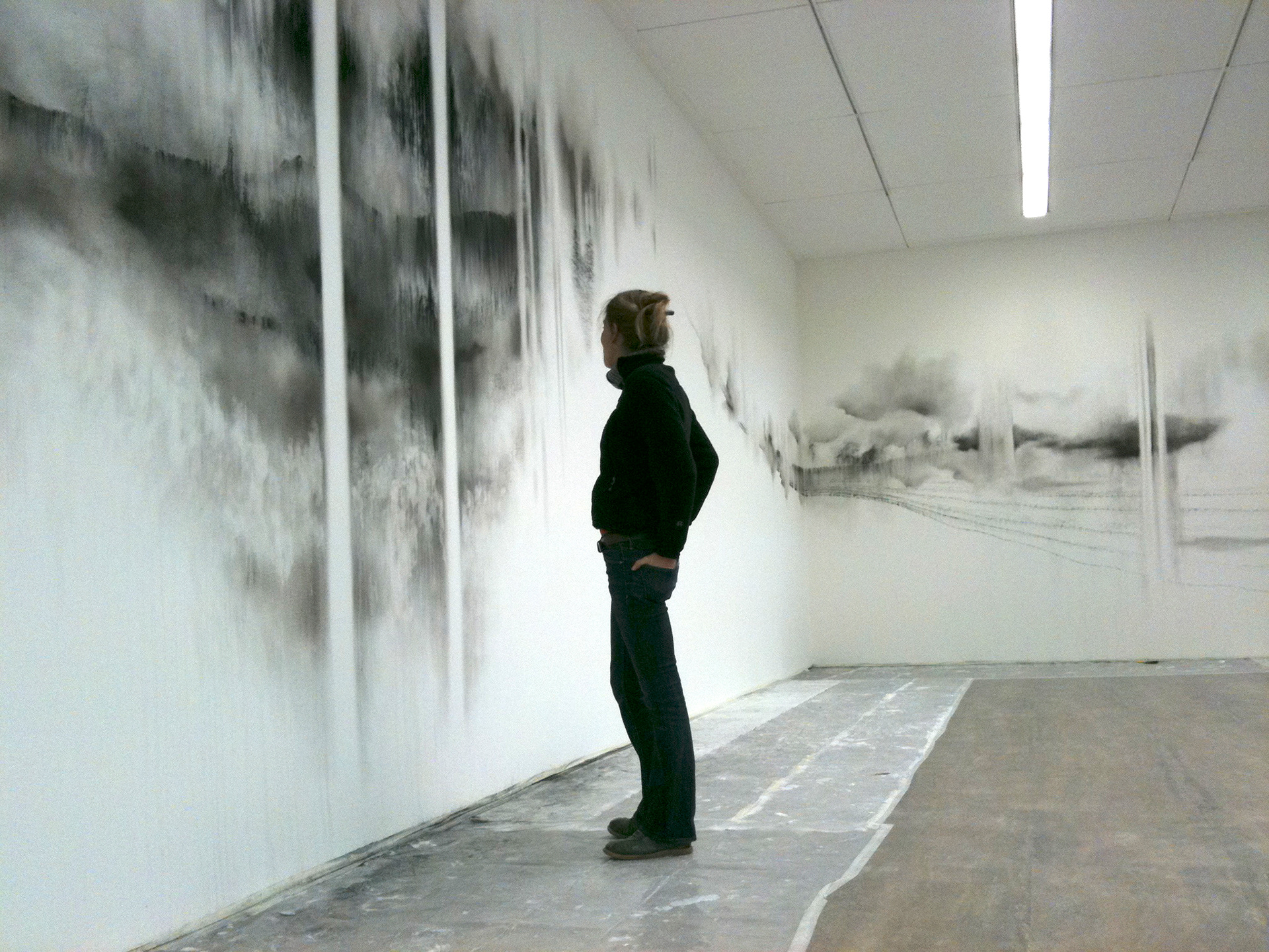 « Traçant ses compositions à même le mur, Ariane Monod exploite les potentialités du fusain sec et gras qu’elle utilise tant sous forme solide que dilué dans l’eau. Elle module la densité des noirs pour faire naître des zones organiques de pénombre ponctuées d’éclaircies. S’ouvrent dans l’oeuvre des perspectives qui, à mesure que l’artiste gratte, lisse ou estompe, forment un paysage onirique aux confins de l’abstrait et du figuratif. Textures végétales et minérales surgissent des flux de la matière : la surface d’un rocher sculpté par l’eau et le vent, l’écume des vagues, le mouvement vaporeux du brouillard, le sillage de l’écorce. Les oeuvres immersives d’Ariane Monod convient le spectateur à la réminiscence d’une atmosphère éprouvée lors de ses nombreux voyages. L’élaboration des ses esquisses murales exigent de l’artiste un réel investissement corporel, performatif. Hissée sur des échelles et des ponts élévateurs, elle met à l’épreuve sa peur du vide. Elle procède d’un geste spontané, sans l’intermédiaire d’un dispositif de projection ou de mise au carreau, puisant dans sa connaissance active du lieu et dans ses croquis préparatoires. A l’instar d’un mirage qui subrepticement se dissipe, le travail d’Ariane Monod demeure éphémère et insaisissable. Placées sous l’ordre du transitoire, ses fresques animent temporairement l’architecture qui les accueille. Lorsque les murs auront retrouvé leur état originel, seules resteront les impressions fugitives imprégnées dans l’esprit des visiteurs et la sauvegarde photographique comme trace de l’activité créatrice ».