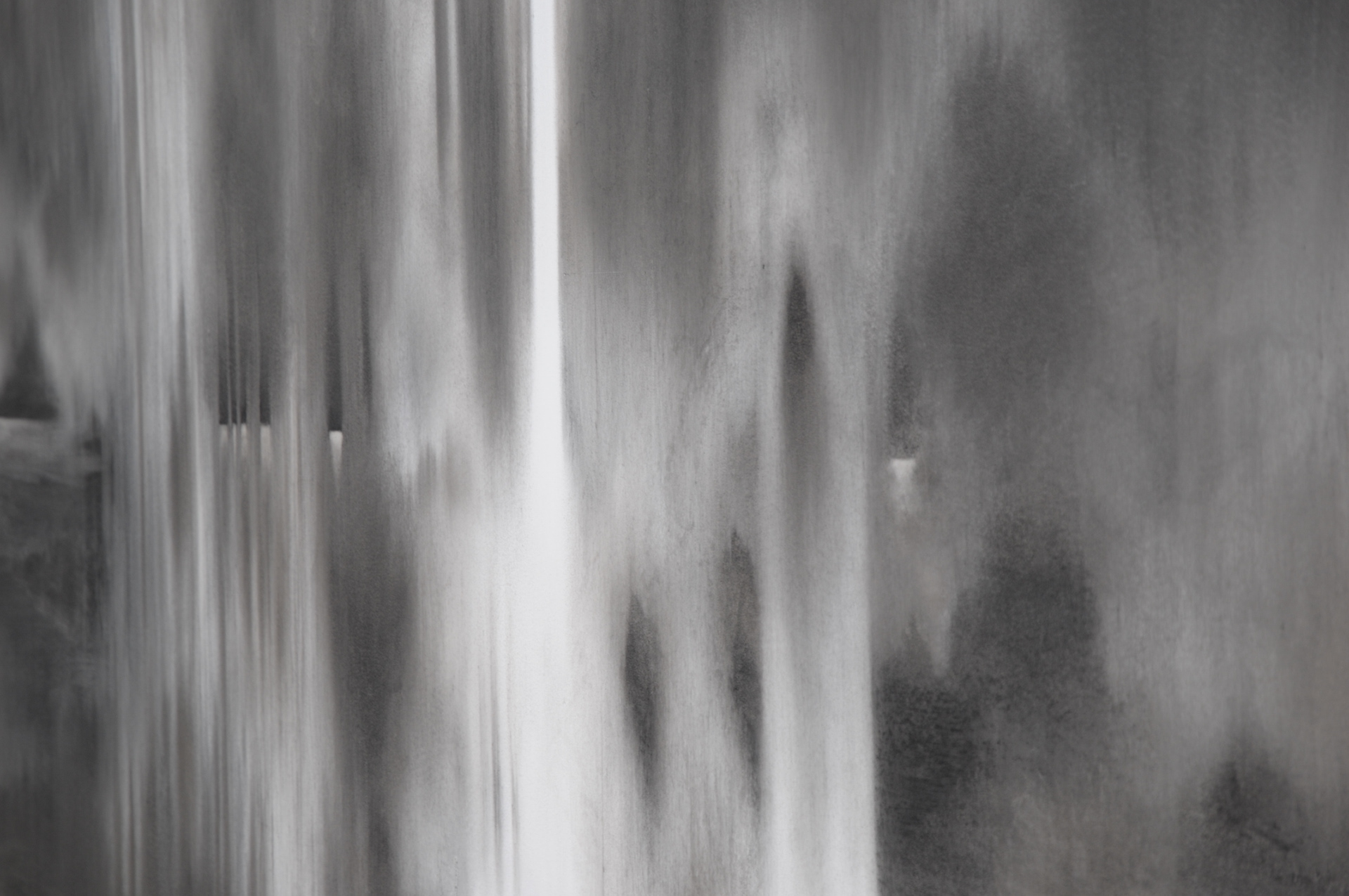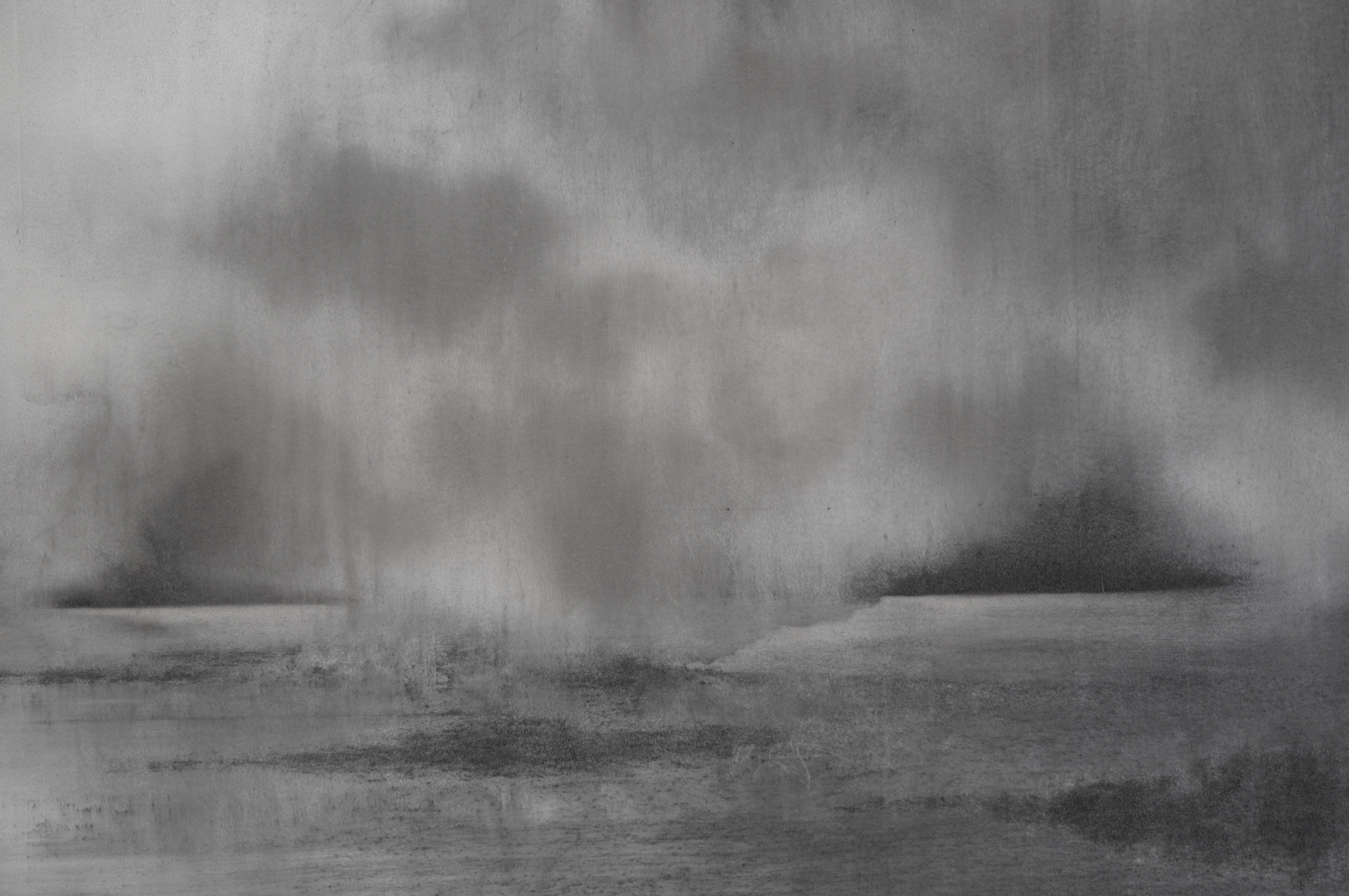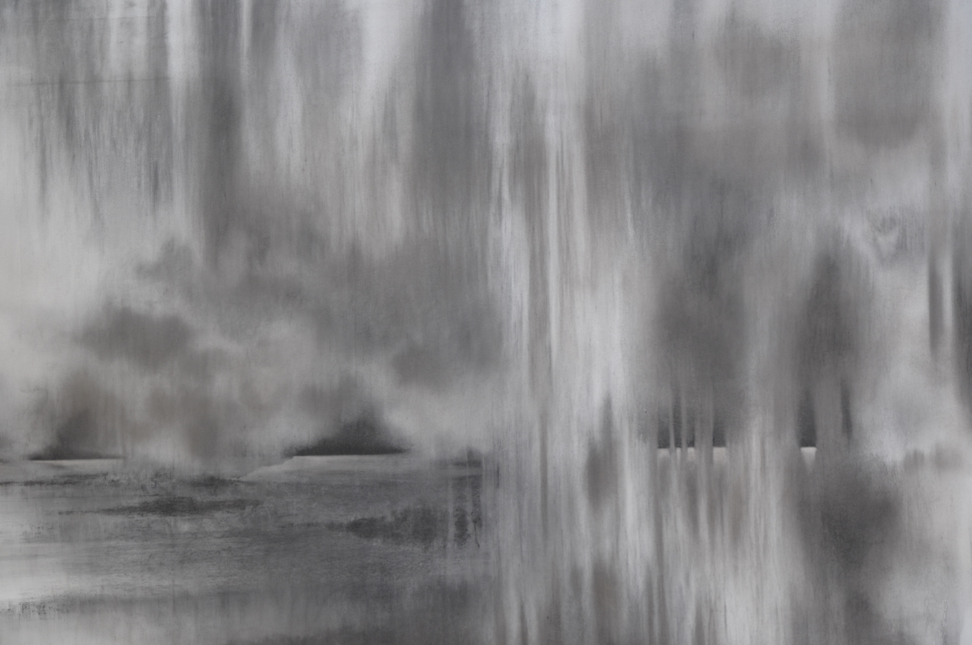 Traçant ses compositions à même le mur, Ariane Monod exploite les potentialités du fusain sec et gras qu’elle utilise tant sous forme solide que dilué dans l’eau. Elle module la densité des noirs pour faire naître des zones organiques de pénombre ponctuées d’éclaircies. S’ouvrent dans l’oeuvre des perspectives qui, à mesure que l’artiste gratte, lisse ou estompe, forment un paysage onirique aux confins de l’abstrait et du figuratif. Textures végétales et minérales surgissent des flux de la matière : la surface d’un rocher sculpté par l’eau et le vent, l’écume des vagues, le mouvement vaporeux du brouillard, le sillage de l’écorce. Les oeuvres immersives d’Ariane Monod convient le spectateur à la réminiscence d’une athmosphère éprouvée lors de ses nombreux voyages.