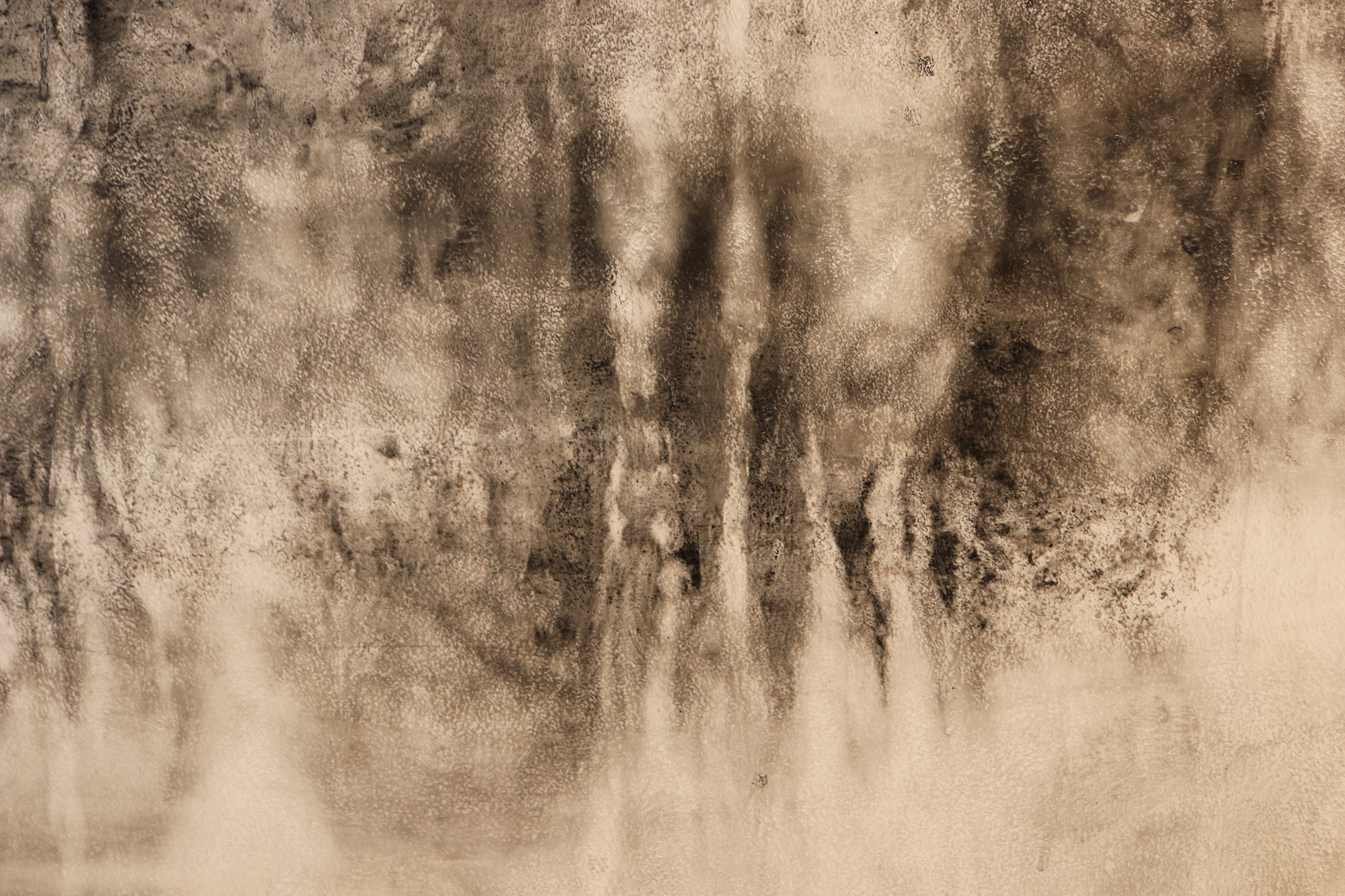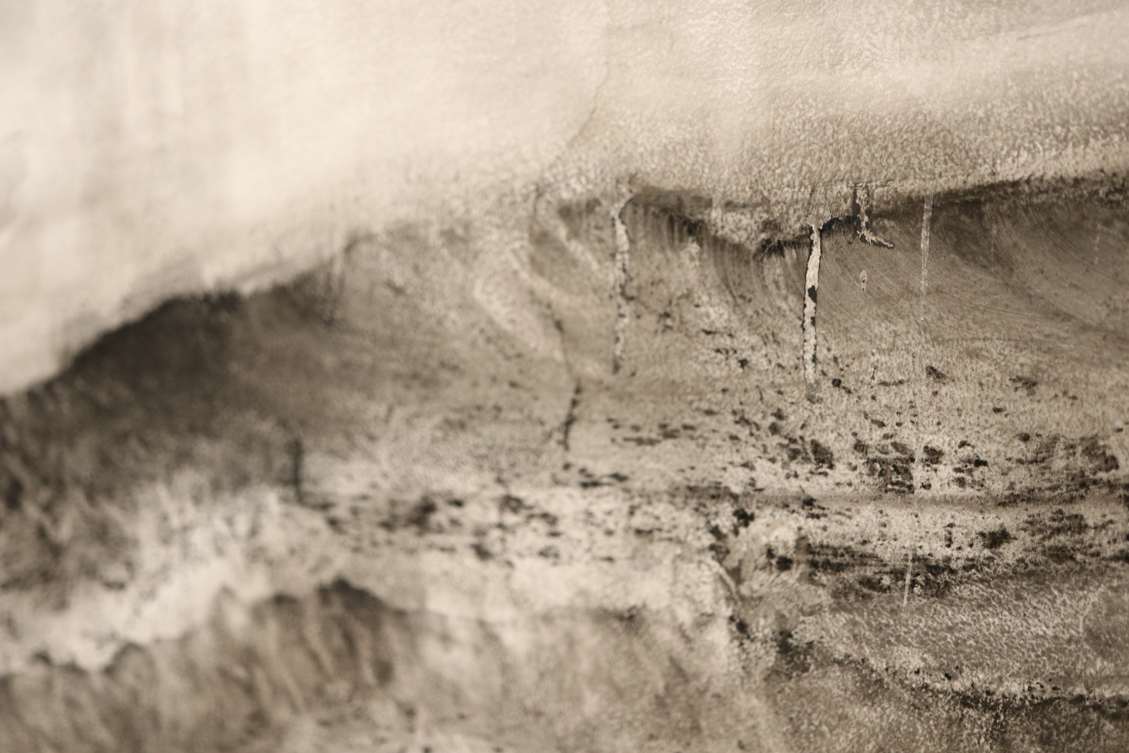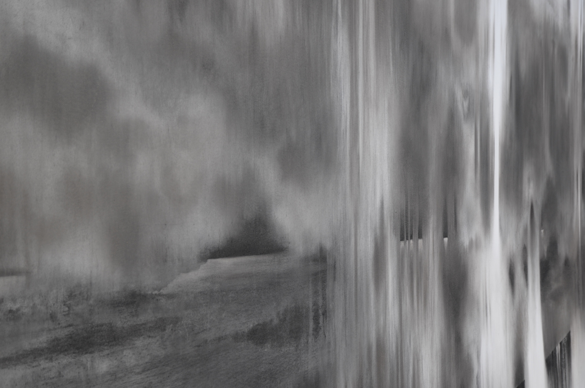 « Esquisse murale », ce terme indique d’emblée avec humilité la recherche d’infini en jeu dans l’œuvre de l’artiste. Une manière peut-être encore et selon le mot d’Aragon à vingt ans de « faire entrer l’infini ». Les outils choisis pour ce processus sont le fusain et l’eau. Le fusain comme chacun sait, est le résultat d’un bois calciné (fusain de saule, gras/sec et compressé) et c’est comme une force d’incandescence cachée qui guide les mains de l’artiste dans une recherche graphique où rejaillit un souffle qui n’est pas sans rappeler celui qui vous prend droit au cœur lorsque vous pénétrez dans les dessins d’une grotte préhistorique. Mais ici nulle présence animale ou humaine, des fragments de nature, de paysages vus et réinterprétés dans une vision subjective où débordent des coulées de falaises suggérées, des vagues de torrents qui se déversent sur on ne sait quel rivage imaginaire. L’artiste a fait de nombreux voyages au Japon. Elle en a gardé le goût de « la contemplation des pierres de lettrés (Gongshi en chinois et Suiseki en japonais) {qui} est un art en soi ». Ariane Monod nous propose alors des images façonnées « par le vent et l’eau ». Si l’Orient est présent, la fresque nous renvoie à quantité de lieux vus dont elle dégage et abstrait un paysage dont l’immobilité n’en est qu’une illusion. Il y a plutôt « arrêt sur image ». Dans un monde porté par la force du souffle. Le vent s’est levé et c’est alors comme des traces d’ondes en mouvement quand l’eau a été caressée d’un seul objet, d’un seul battement d’aile, même d’oiseaux absents. Des coulures rupestres ont laissé leurs dessins comme des pleurs de nature alanguie en recherche de traces d’éternité.